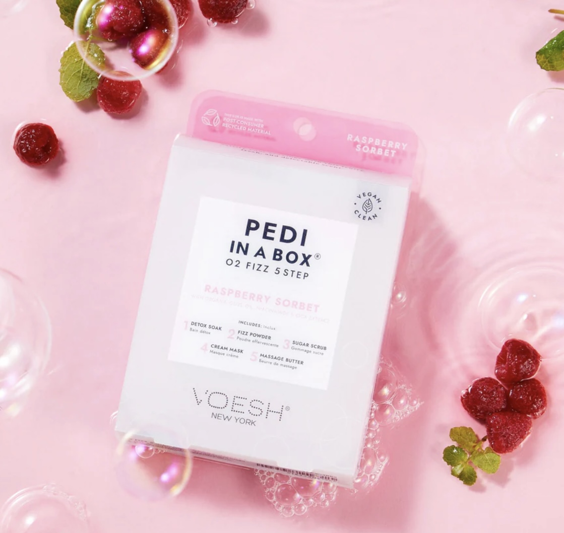 The VOESH Pedi In A Box O2 Fizz 5 Step Raspberry Sorbet benefits include detoxifying and cleansing feet with its fizz and soak, eliminating impurities, exfoliating dead skin, and intensely moisturizing and softening the feet with the mask and butter. The fizzy O2 effect also helps to boost blood circulation, which is good for overall foot health, and the raspberry sorbet fragrance offers an enjoyable and refreshing scent.